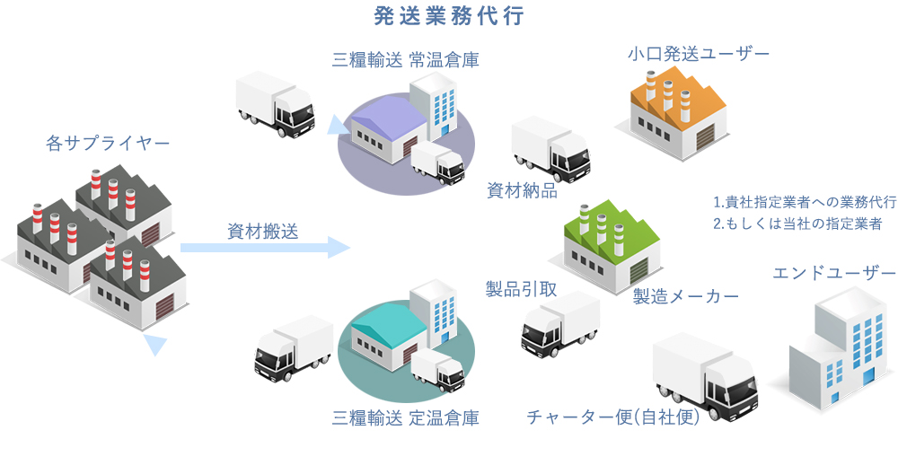 当社では、資材の調達から、倉庫での保管や管理、検品・仕分け・ラベリングなどの物流加工、お客さままでの配送、自社倉庫と物流機能を駆使し企業物流を最適化する包括的なサービスを提供しています。