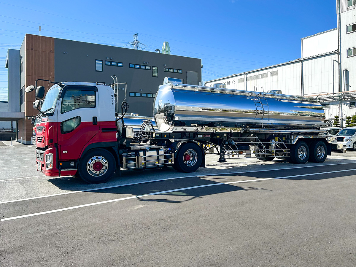 主に異性化糖やシロップ類の輸送を目的としたローリーです。液溜まりしない排出のよいタンクと配管、しかも蒸気殺菌に耐え得る衛生的な構造で設計されたステンレスローリーを使用しています。